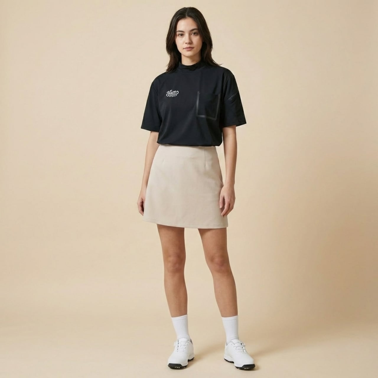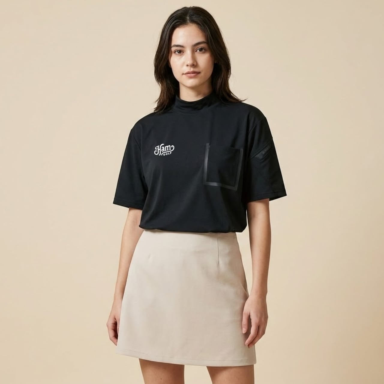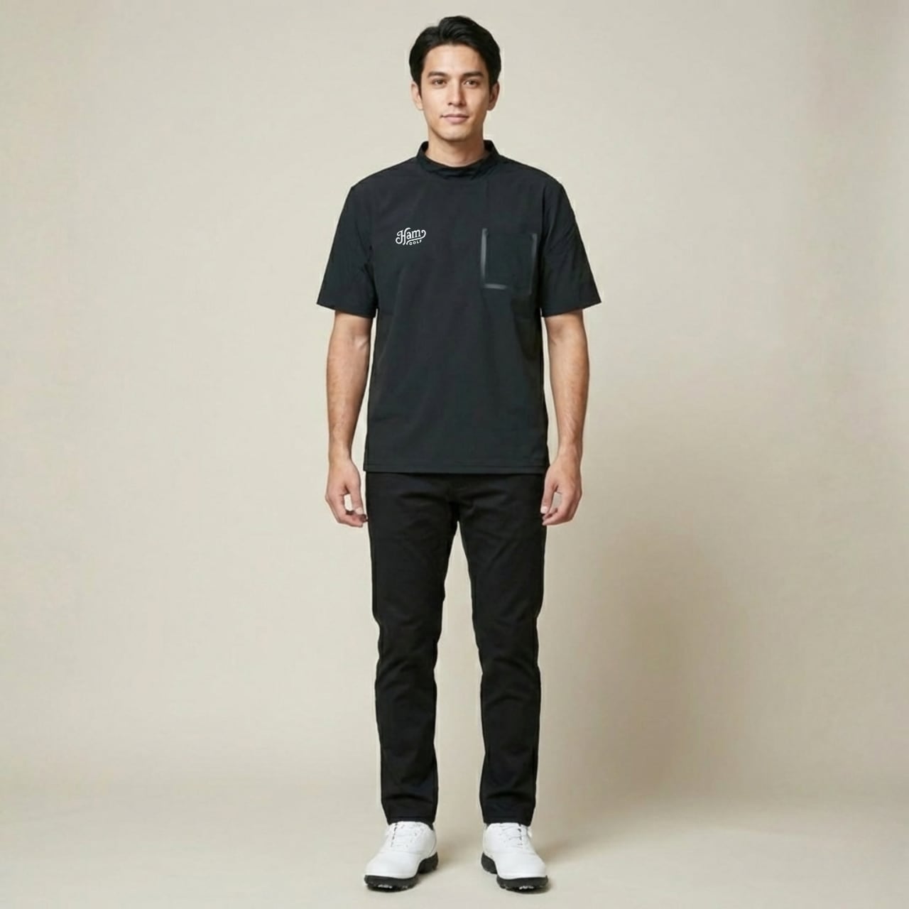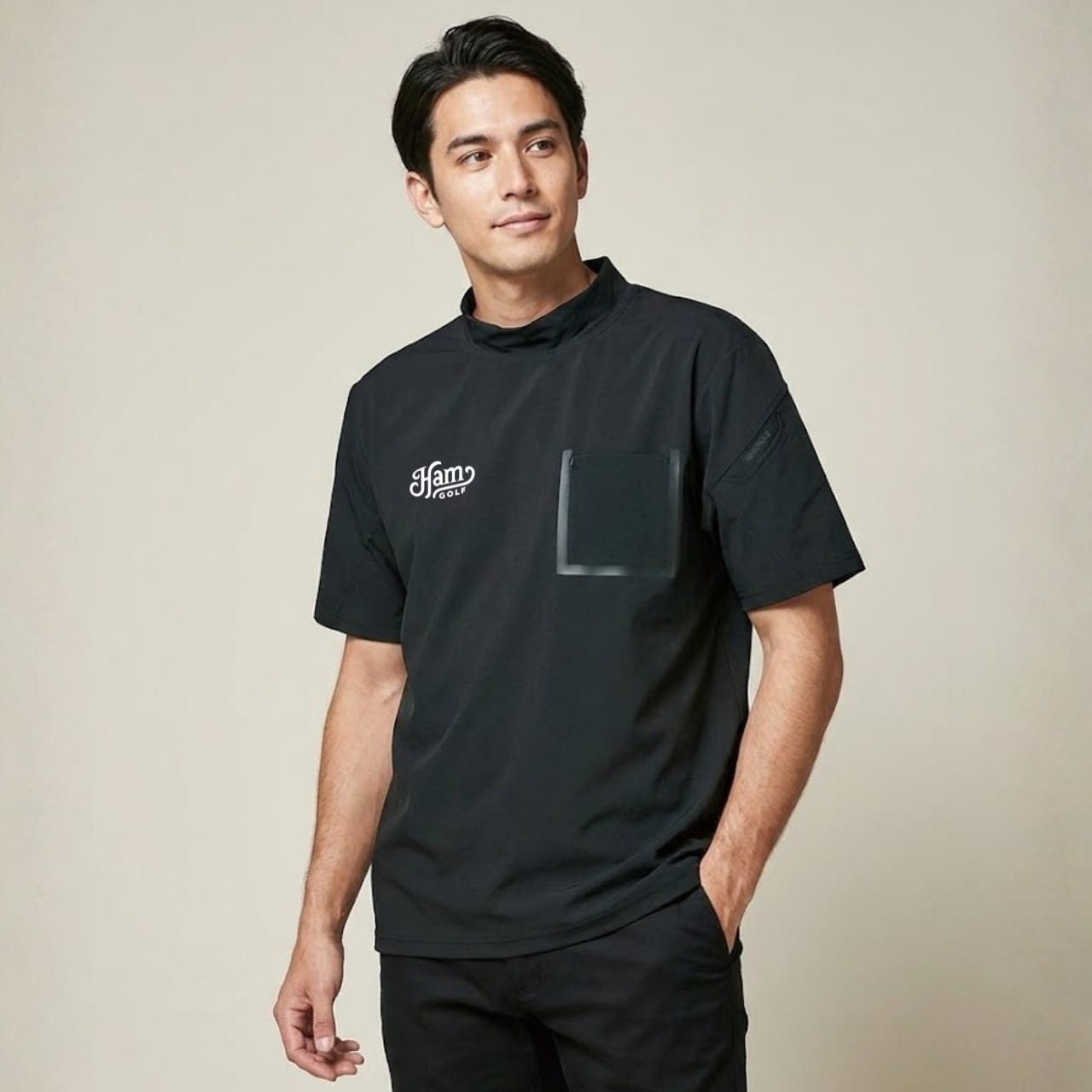 フロントにはHamGOLFクラシックロゴをワンポイントで配置し、左胸にスクエアポケットをさりげなく装備。