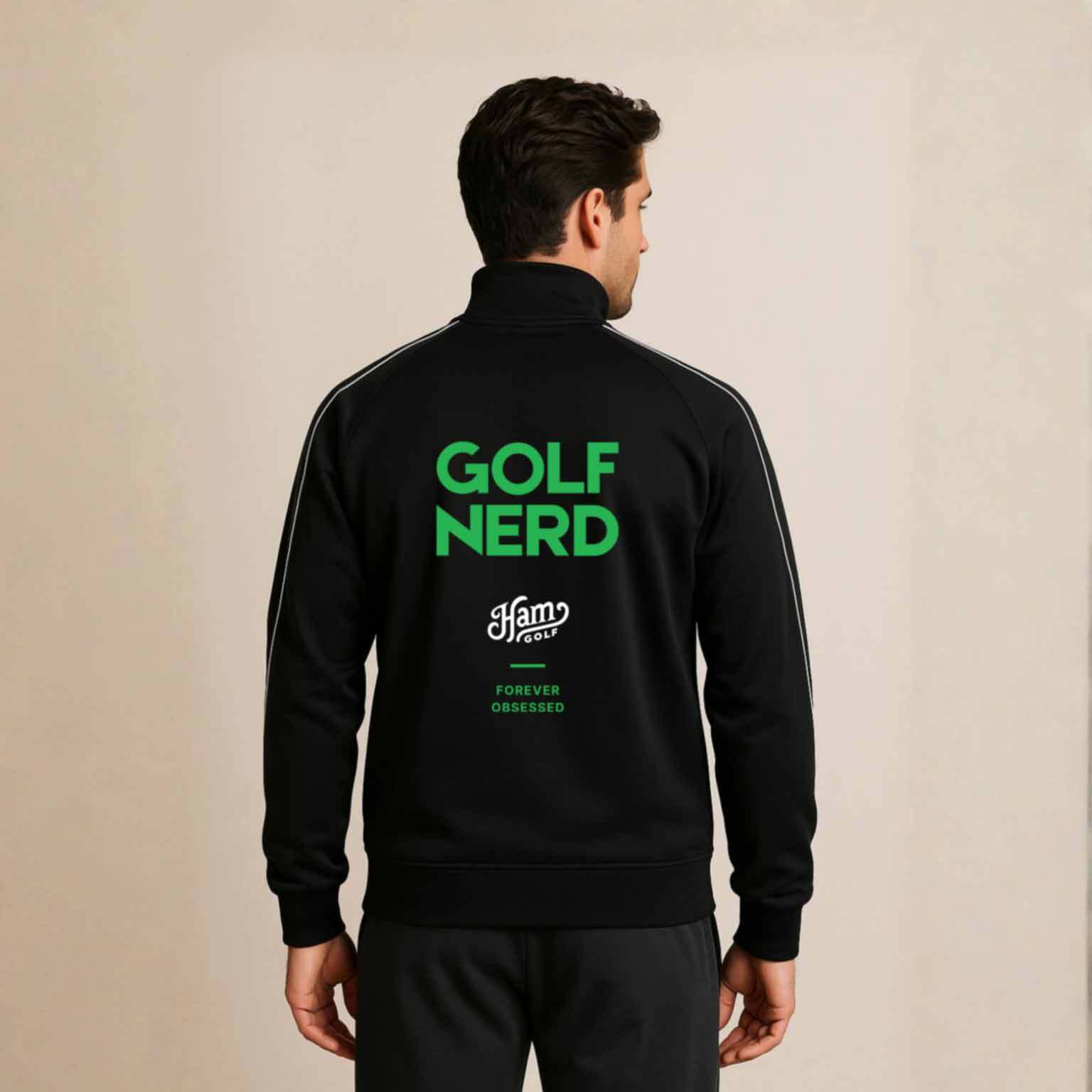 背面の「GOLF NERD」ロゴが静かに個性を主張し、胸元のメガネハムスター「グラント」のアイコンが洗練された印象を添えます。