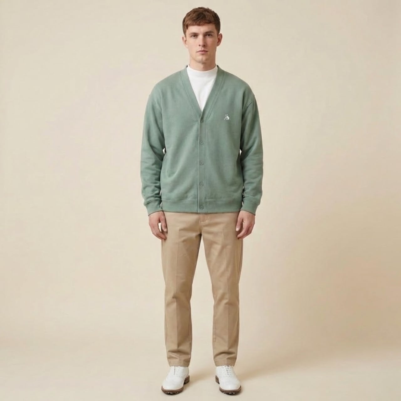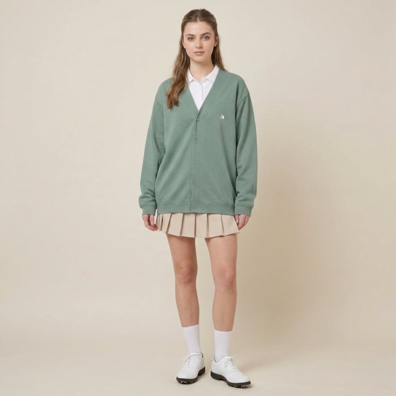ゆったりとしたシルエットが魅力のコットンカーディガン。 胸元の【シモンズ】プリントがさりげない遊び心を添え、襟下のロゴがブランドらしいアクセントに。 10.0オンスの綿100%生地を使用し、ほどよい厚みと柔らかな肌ざわりを実現。 軽やかな着心地ながらも、ルーズフィットなシルエットが抜け感のあるスタイルを演出します。 ポロシャツやモックネックとのレイヤードはもちろん、ラウンド前後の羽織としても活躍。 シーンを問わず楽しめる、HamGOLFらしい万能な一着です。 ■カラー/サイズ ・カラー:スモーキーグリーン ・サイズ:M、L、XL ■モデル/着用サイズ 男性:175cm / Lサイズ 女性:170cm / Mサイズ ■寸法一覧(単位:cm) M 着丈70 身幅56 肩幅54 袖丈61 L 着丈73 身幅59 肩幅57 袖丈62 XL 着丈76 身幅62 肩幅60 袖丈63 ■素材 綿 100% オープンエンド糸 アッシュ:綿 98%、ポリエステル 2% オープンエンド糸 ■注意事項 ・商品画像は実際の商品と若干異なる場合があります。 ・お届けまでに約10営業日前後かかります。