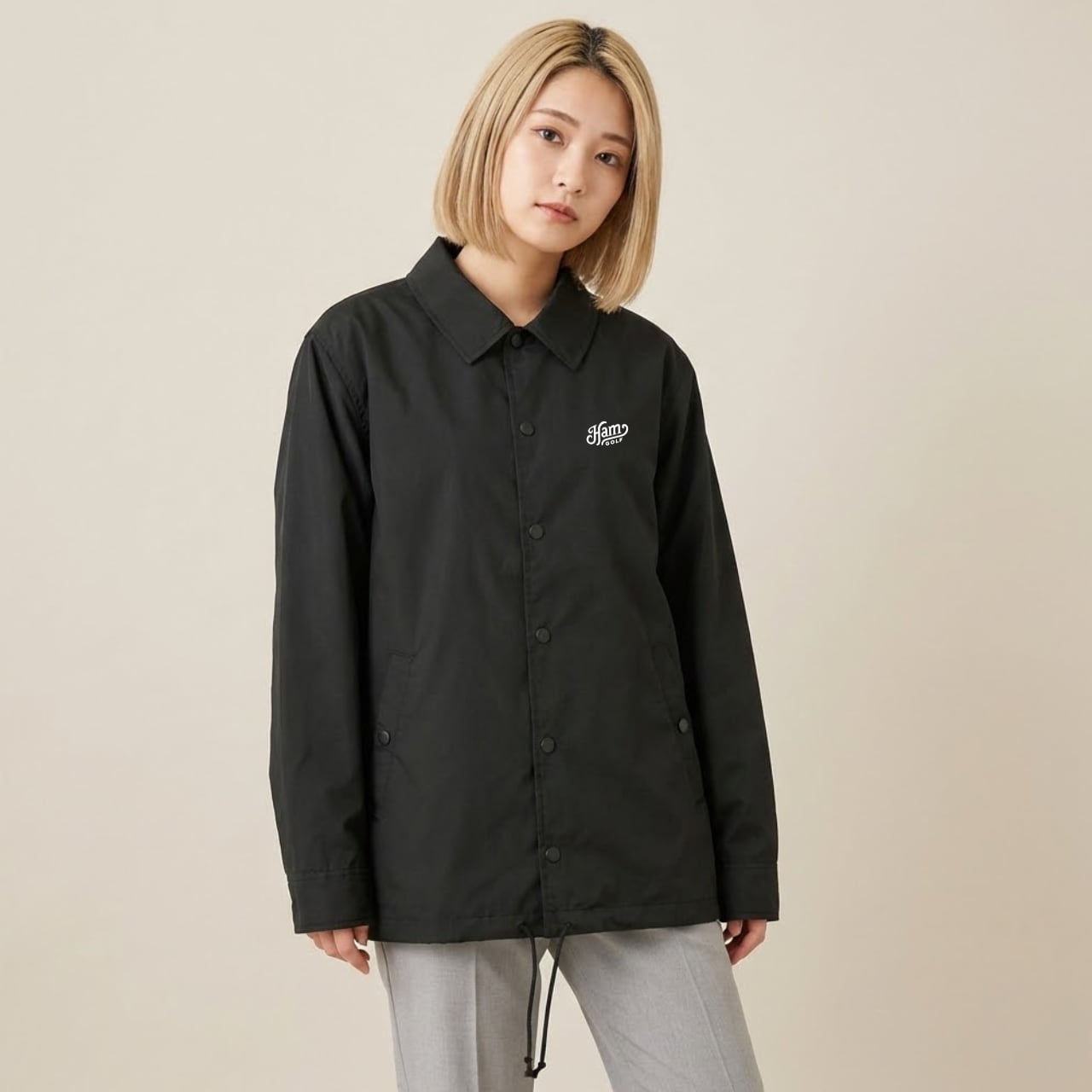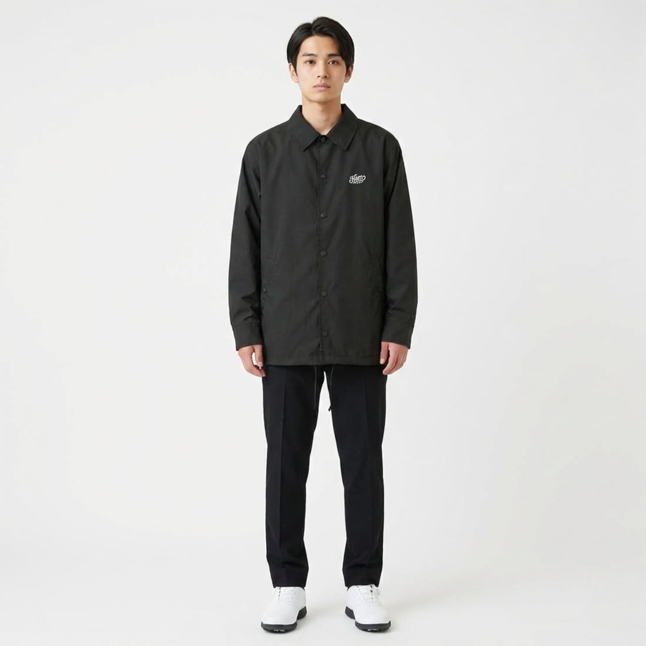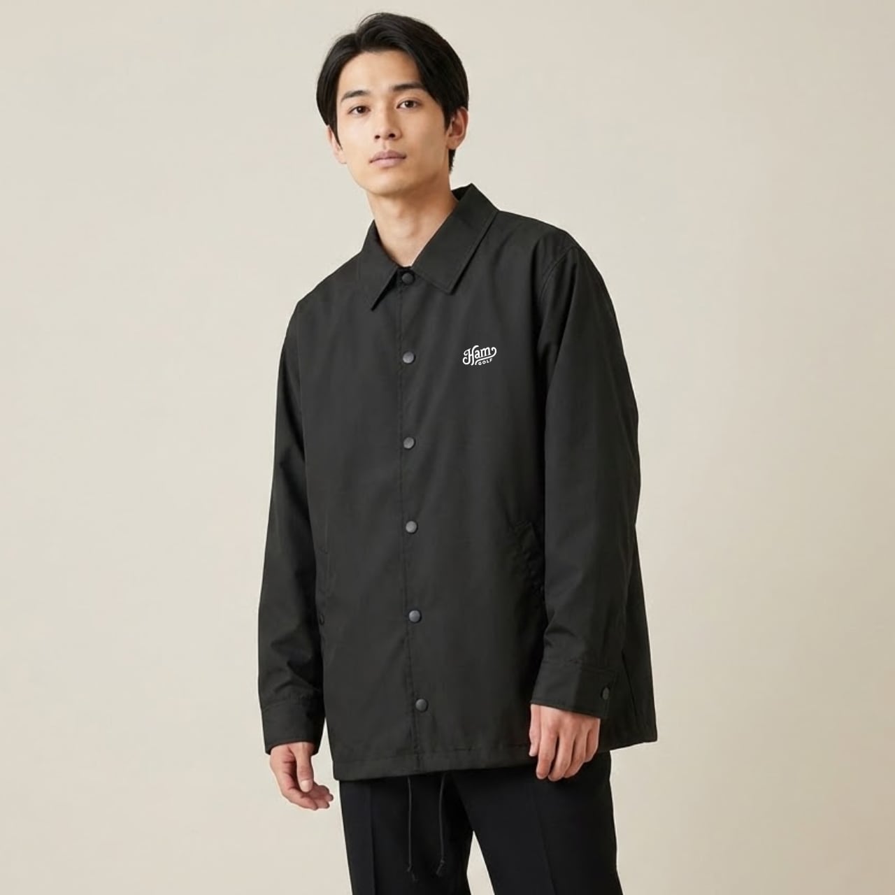 CAMOHAMシリーズに、オールシーズン対応のコーチジャケットが登場。 通気性と撥水性を両立した軽量ボディは、ラウンド前後から練習、日常使いまで幅広く活躍します。 両脇ポケット付きで実用性も確保。 天候の変わりやすい季節でも、さっと羽織れて快適な着心地を保ちます。 ゴルフウェアとしても、街着としても。 CAMOHAMらしい静かな存在感を楽しめるコーチジャケットです。 ■カラー/サイズ ・カラー:ブラック ・サイズ:S、M、L、XL ■モデル/着用サイズ 男性:180cm / XLサイズ 女性:168cm / Mサイズ ■寸法一覧(単位:cm) S 肩幅44 身幅53 着丈67 袖丈61 M 肩幅47 身幅56 着丈70 袖丈63 L 肩幅50 身幅59 着丈73 袖丈65 XL 肩幅53 身幅62 着丈76 袖丈67 ■素材 表地:ポリエステル65% 綿35% (表面:フッ素系撥水 裏面:アクリルコーティング) 裏地:ポリエステル100% ■注意事項 ・商品画像は実際の商品と若干異なる場合がありますのでご了承ください。 ・商品お届けまでに約10営業日前後かかります。
