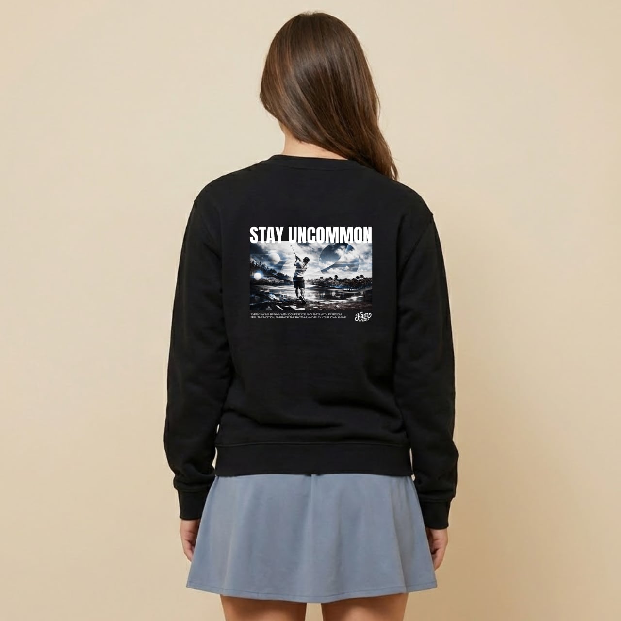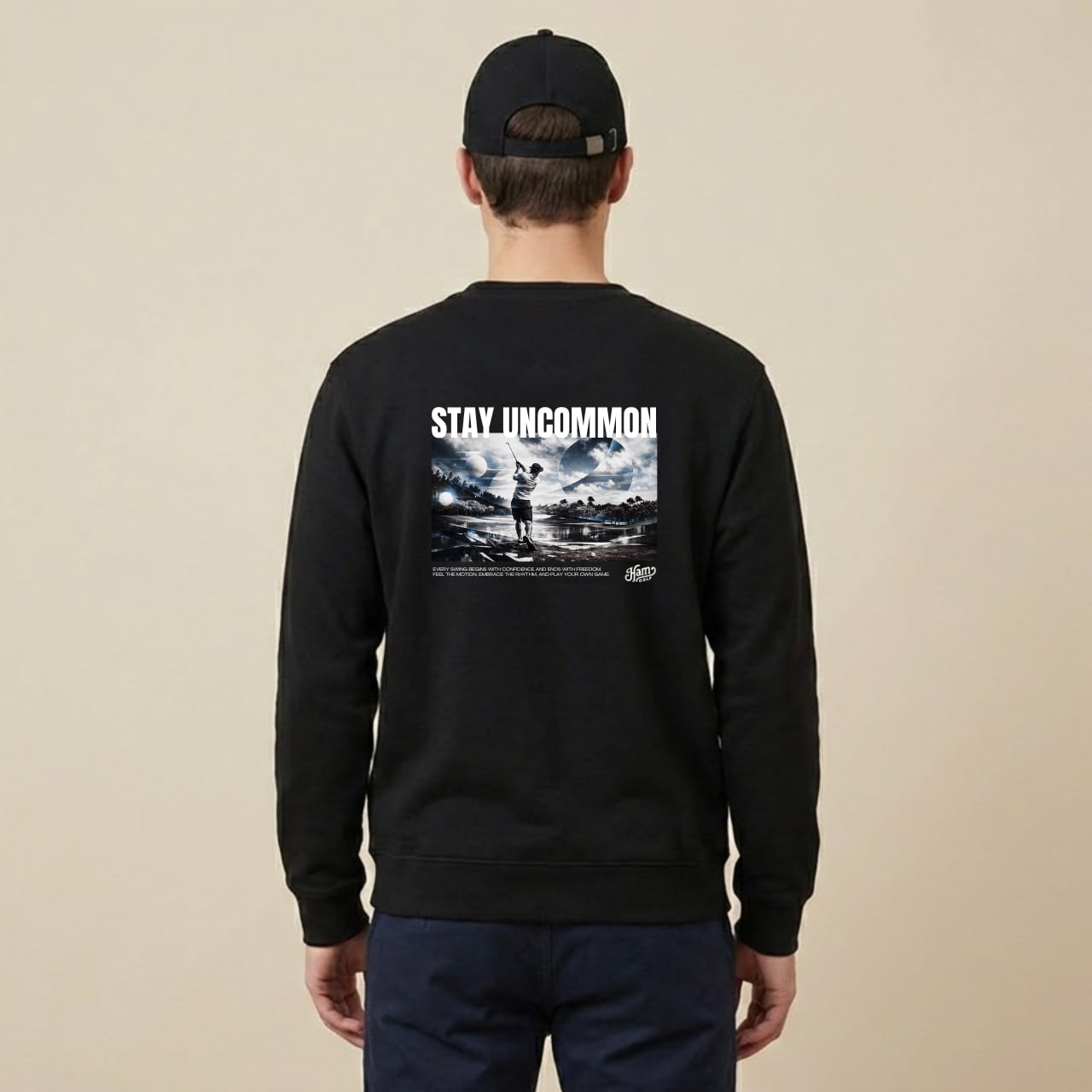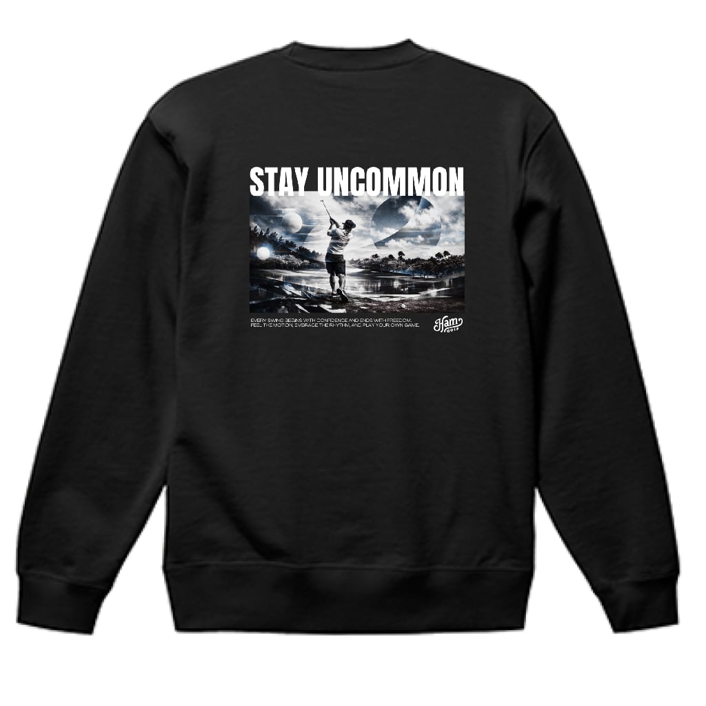 背中で語るゴルフスタイル。「ORBIT SWING SWEAT」がリリース。 最大の特徴は、背中に大胆に配置されたバックプリント。「STAY UNCOMMON(非凡であれ・常識に囚われるな)」というメッセージと共に、ダイナミックなスイングの瞬間をグラフィックに落とし込みました。ゴルフウェアとしての機能性だけでなく、ストリートシーンでも映えるデザインに仕上がっています。 左胸にはHamGOLFのキャラクター「シモンズ」を配置し、遊び心と洗練のバランスを添えます。 厚すぎず薄すぎない10oz(オンス)の生地を採用。内側は吸水性と伸縮性に優れた裏パイル地なので、スイング時の動きを妨げず、ロングシーズン快適に着用いただけます。 『普通』はいらない。ゴルフウェアの枠を飛び越えた、自由な感性を持つゴルファーへ。 ■カラー/サイズ ・カラー:ブラック ・サイズ:S、M、L、XL ■モデル/着用サイズ 男性:181cm / XLサイズ 女性:168cm / Mサイズ ■寸法一覧(単位:cm) S 肩幅44 身幅52 身丈63 袖丈57 M 肩幅48 身幅55 身丈67 袖丈59 L 肩幅52 身幅58 身丈71 袖丈60 XL 肩幅55 身幅63 身丈76 袖丈61 ■素材 綿 100% 裏パイル ■注意事項 ・商品画像は実際の商品と若干異なる場合がありますのでご注意ください。 ・商品お届けまでに約10営業日前後かかります。