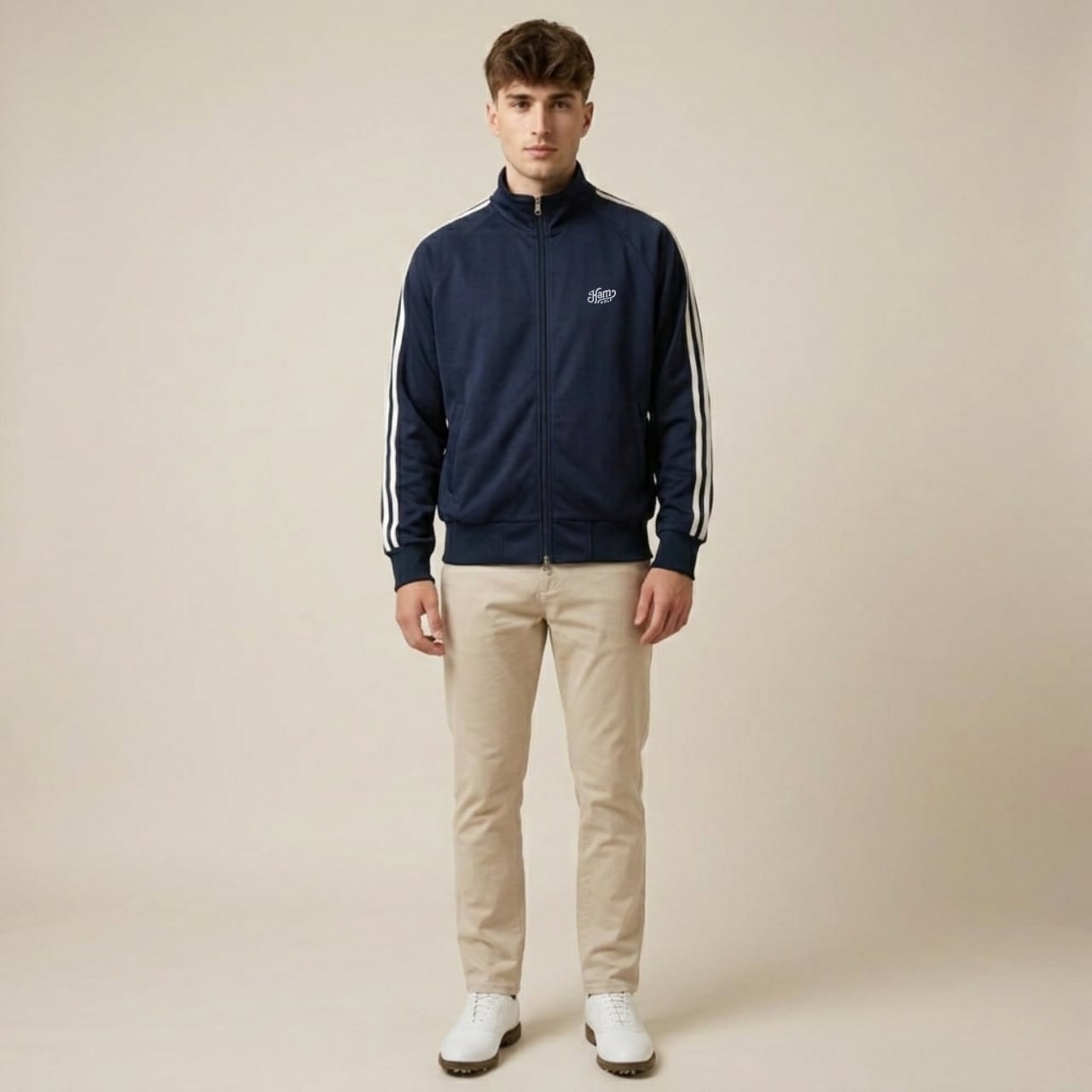 「THE STACK」シリーズに、待望のトラックジャケットがラインナップ。 左胸にはワンポイントロゴのみでシンプルかつ上品に仕上げ、洗練されたスポーティさを演出。一転して背面には、「HAMGOLF」のタイポグラフィをブロック状に積み上げた、シリーズ象徴のビッグロゴを大胆に配置しました。 フェアウェイを歩く後ろ姿や、スイングのフィニッシュで、確かな存在感を放つ一着です。 なめらかな肌触りと適度な伸縮性が魅力の7.0oz(オンス)スムース素材を採用。 肩の動きを妨げないラグランスリーブ仕様により、スムーズなスイングを実現します。また、ダブルファスナー仕様のため、プレー中のシルエット調整や、体温調節もスムーズに行えます。 ゴルフ場でのプレーはもちろん、練習場への行き帰りやタウンユースまで、シーズンを問わずスマートに着こなせるマストバイアイテムです。 ■カラー/サイズ ・カラー:ネイビー ・サイズ:S、M、L、XL ■寸法一覧(単位:cm) S 身丈60 身幅52 裄丈80 M 身丈64 身幅57 裄丈84 L 身丈68 身幅62 裄丈87 XL 身丈71 身幅68 裄丈90 ■素材 ポリエステル 100% スムース ※ファスナーはダブルスライダーです。 ■注意事項 ・商品画像は実際の商品と若干異なる場合がありますのでご注意ください。 ・商品お届けまでに約10営業日前後かかります。