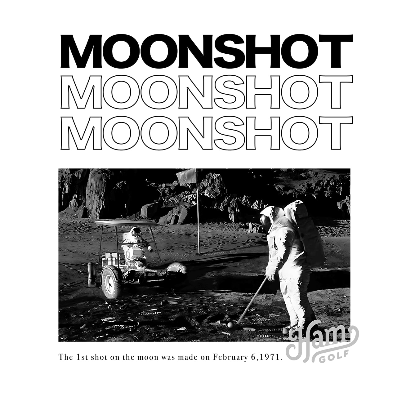 1971年2月6日、アラン・シェパードが月面でゴルフボールを打った歴史的な瞬間をモチーフにした【MOON SHOT】。バックにはその象徴的なシーンが描かれており、着る人の遊び心と好奇心、あくなき挑戦心をさりげなく表現します。